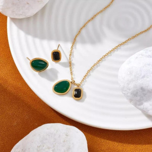 Juego de Collar y Pendientes estilo sin Ronda Oval Acero Titanio embutido en Pedreria verde