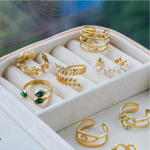 Anillo ajustable para dama con piedras preciosas, en acero inoxidable, chapado en oro 14k
