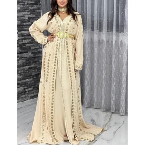 Caftán de Oriente Medio para mujer marroquí árabe en marron claro y dorado estampado con cinturon