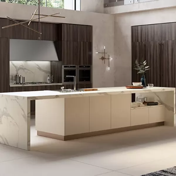 Los gabinetes de chapa de nogal y los electrodomésticos integrados están completamente integrados en la pared para crear un efecto limpio y elegante. La veta de madera de nogal oscuro en dos caras de las paredes solo se rompe por la encimera Calacatta y el protector contra salpicaduras.