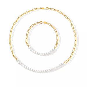 Juego de Collar y Pendientes Moda Geometrica Acero Inoxidables chapado en Oro con Perla de Colgante