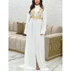 Vestido caftán estilo árabe azul blanco con dorado, con lindo cuello alto y cinturón para mujer Abaya de Dubái