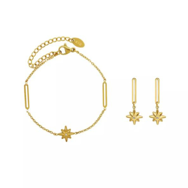 Tipo producto Joyería Tipo Joya Brazalete Composición Acero Inoxidable Parilti SKU ps-bra079 Juego de pendientes y pulsera diseño de Estrellas chapado en Oro Acero Inoxidable Solicito presupuesto