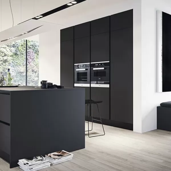 Gabinetes de cocina en negro puro con materiales de melamina de estilo simple moderno