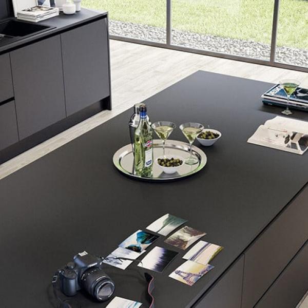- Encimera: Cuarzo 20mm color negro puro, ambos lados cascada